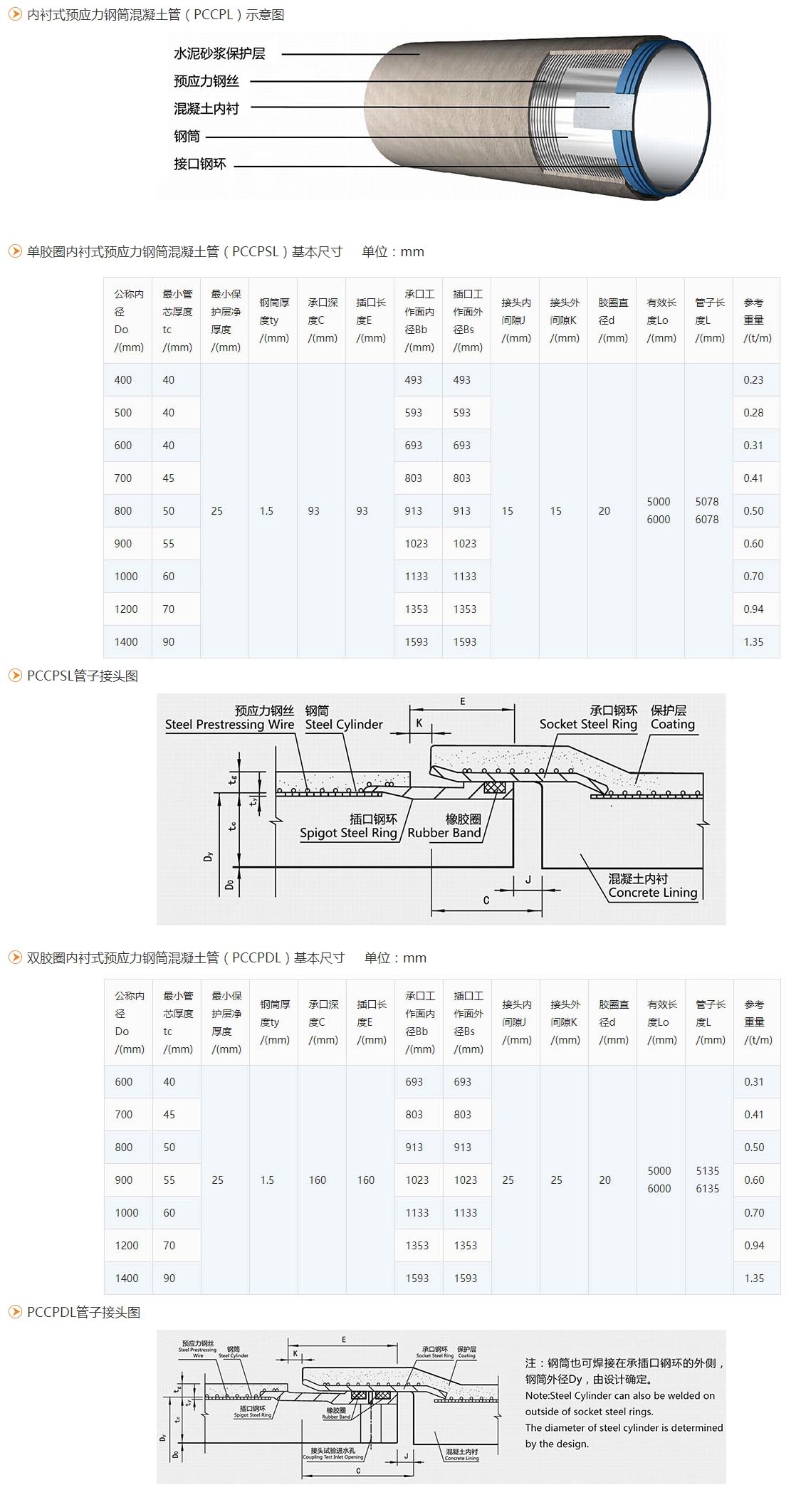 埋置式預(yù)應(yīng)力鋼筒混凝土管(PCCPE)是PCCP的一種。由鋼筒和鋼筒內(nèi)外兩側(cè)混凝土層組成管芯,并在管芯混凝土外側(cè)纏繞環(huán)向預(yù)應(yīng)力鋼絲,然后制作水泥砂漿保護(hù)層而制成的管子。包括單膠圈(PCCPSE)和雙膠圈(PCCPDE),我公司可生產(chǎn)口徑DN600mm-DN4000mm,采用美國(guó)標(biāo)準(zhǔn),承受內(nèi)壓可達(dá)2.5Mpa。