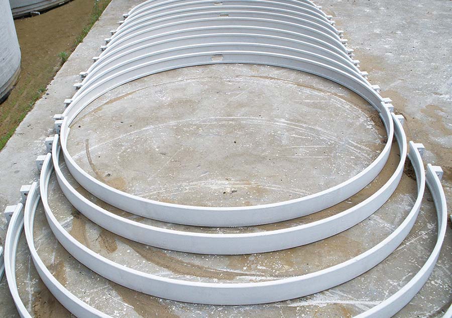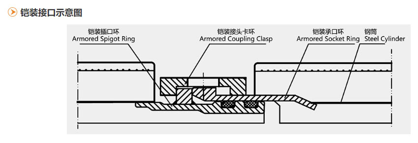 鎧裝接頭預(yù)應(yīng)力鋼筒混凝土管是預(yù)應(yīng)力鋼筒混凝土管(PCCP)的技術(shù)改進(jìn)產(chǎn)品,是為有效克服PCCP管線內(nèi)部軸向推力而預(yù)先設(shè)計(jì)的系縛式接頭方式通常應(yīng)用在管線的轉(zhuǎn)向處、管線的變截面處、管子與管配件毗鄰處和管線的終端。鎧裝接頭結(jié)構(gòu)形式是在普通承口、插口上設(shè)置止推環(huán),通過槽型鎧裝卡環(huán)卡住承插口上的止推環(huán)形成鎧裝,使管道間的軸向力可以傳遞。